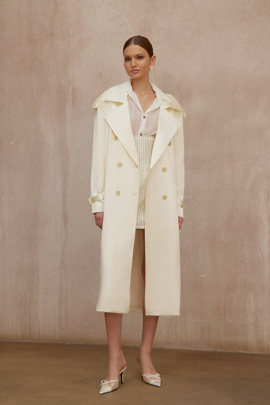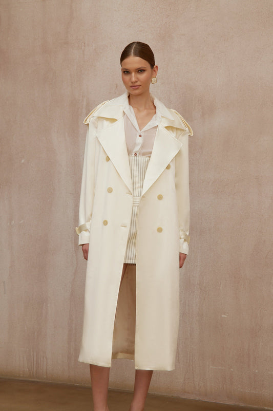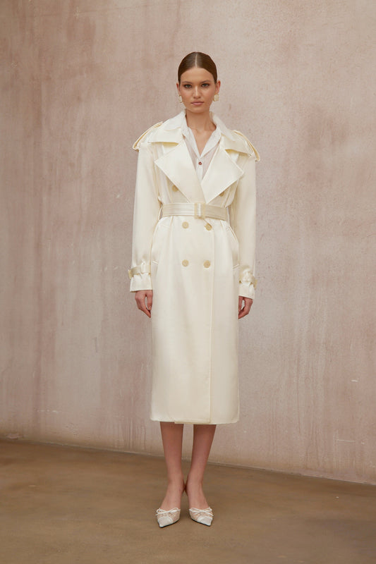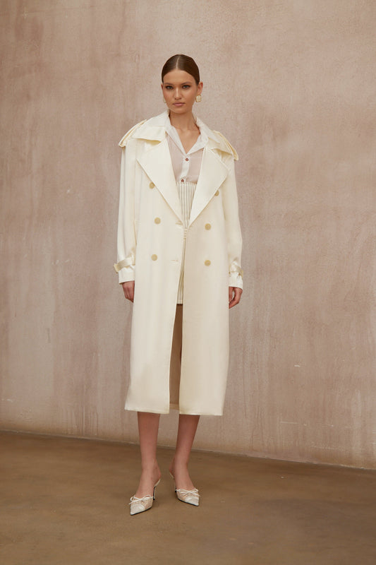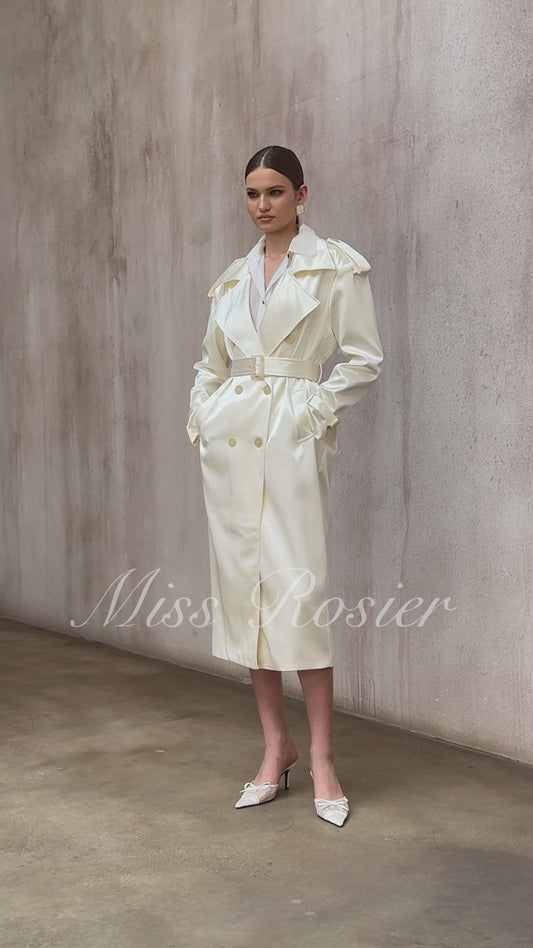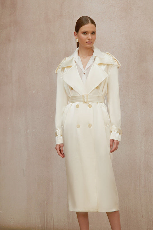 Amélie Cream White Satin Long Trench Coat