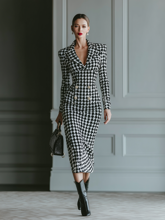 Women's Black And White Houndstooth Wool Blend Lapel Midi Dress