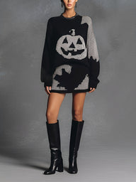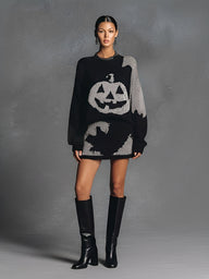 A black and grey oversized sweater dress featuring a playful pumpkin graphic. Cozy, festive, and perfect for Halloween mood styling.