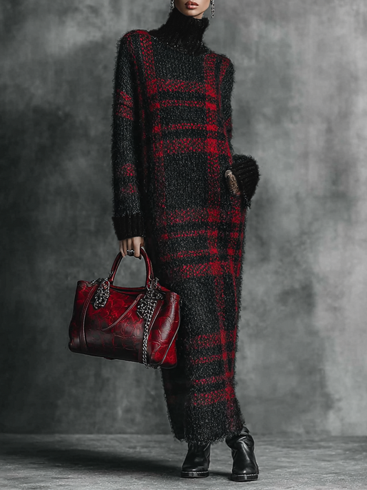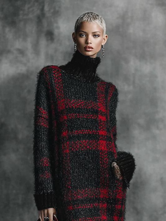 Women's Fashionable Loose Red And Black Plaid High Collar Knitted Maxi