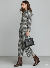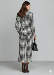 Make a statement with this sophisticated houndstooth two-piece set, featuring a tailored double-breasted blazer with a matching belt and sleek cropped pants. The timeless houndstooth pattern brings classic refinement, while the modern silhouette and cropped pant length add a contemporary edge. Ideal for elevating your professional wardrobe or making an impression at special events.