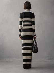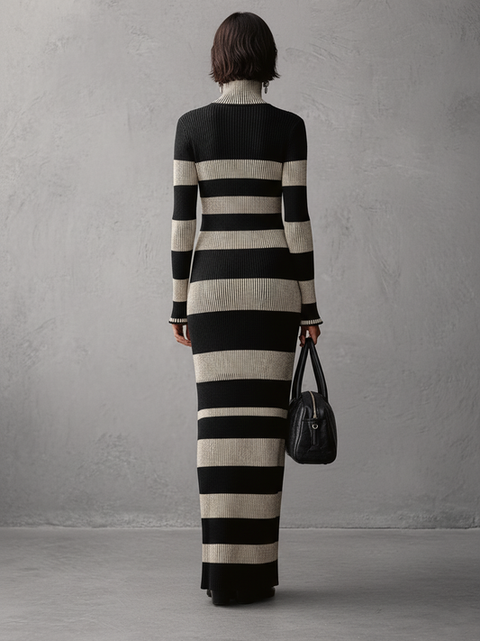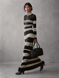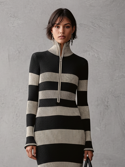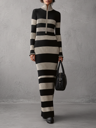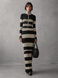 Women’s Striped Jacquard Zip-up Neck Knitted Maxi Dress