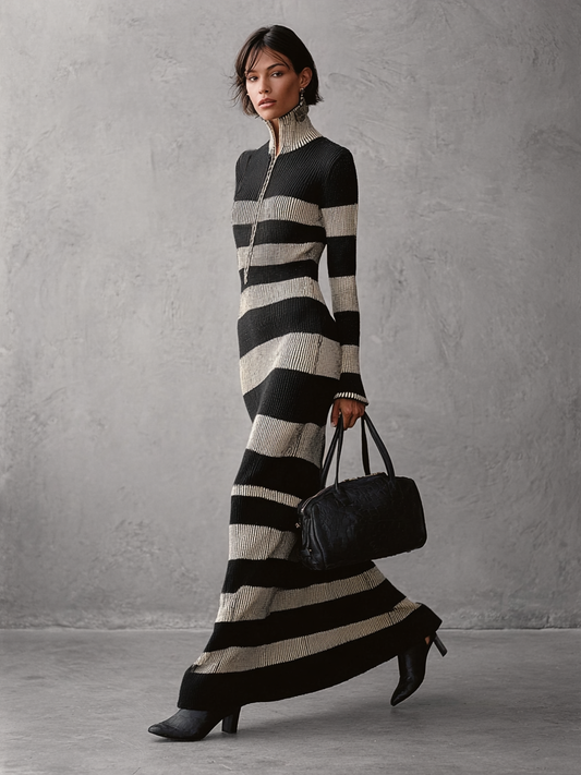 This sophisticated maxi dress is crafted from soft, stretchy knit fabric and features a vibrant striped jacquard pattern. Designed with a contemporary zip-up neckline, it balances comfort and modern style—perfect for work, gatherings, or everyday wear.