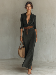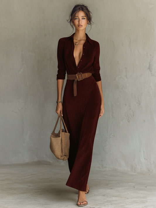 Women's Suede Single-breasted Lapel Belt Maxi Dress