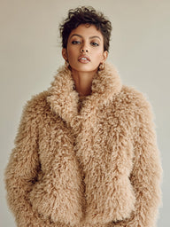 Women’s Beige Chic Curly Faux Fur Wide-Collar Cropped Jacket