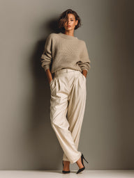 Women’s Beige Classic Knit Oversized Sweater & High-Waisted Pleated Trousers Set