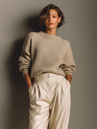 A beige knit oversized sweater paired with high-waisted pleated trousers. It’s comfortable, stylish, and great for casual or smart-casual days.
