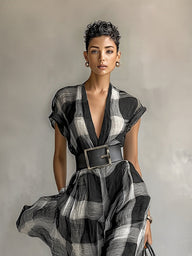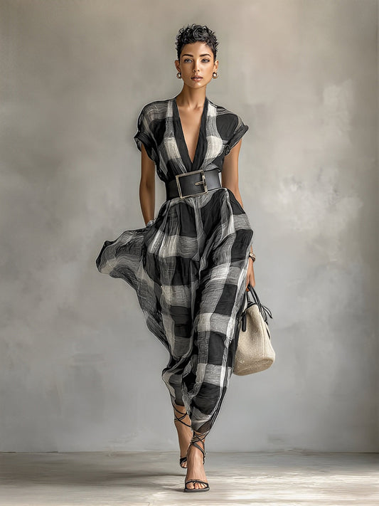 This feminine maxi dress features a lightweight chiffon fabric with a classic plaid pattern. The V-neckline and cap sleeves create a delicate silhouette, while the waist belt defines your shape for an elegant finish.