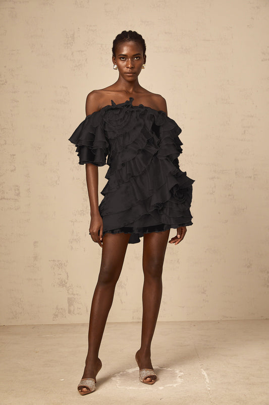 Siyah kiraz rengi asimetrik fırfırlı mini elbise (Sadece ABD)